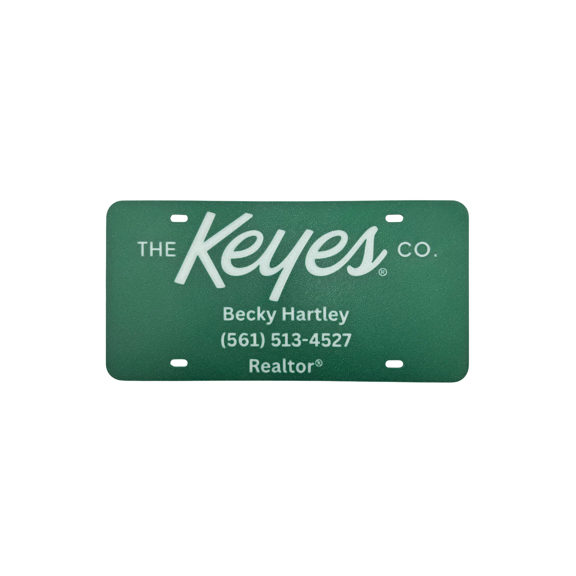 Showcase your pride and professionalism on the road with this sleek, customized license plate featuring The Keyes Company branding. Perfect for agents who want to represent their brokerage with style, this plate is made from durable, weather-resistant materials. Whether parked at a listing or cruising through your farm area, it's a subtle yet powerful way to promote your affiliation with one of Florida’s most respected real estate companies. Personalization options available which include the choice of two Keyes logos and includes 3 lines of customizable text for your name, phone number and Realtor designation.